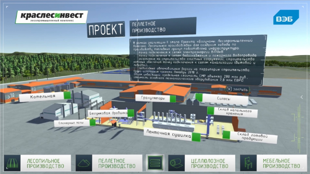 Составляющие элементы «Краслесинвеста» по проекту – лесопильный цех, завод по производству топливных гранул, целлюлозное производство. Под эти объекты была запланирована промышленная площадка в Богучанском районе Красноярского края.